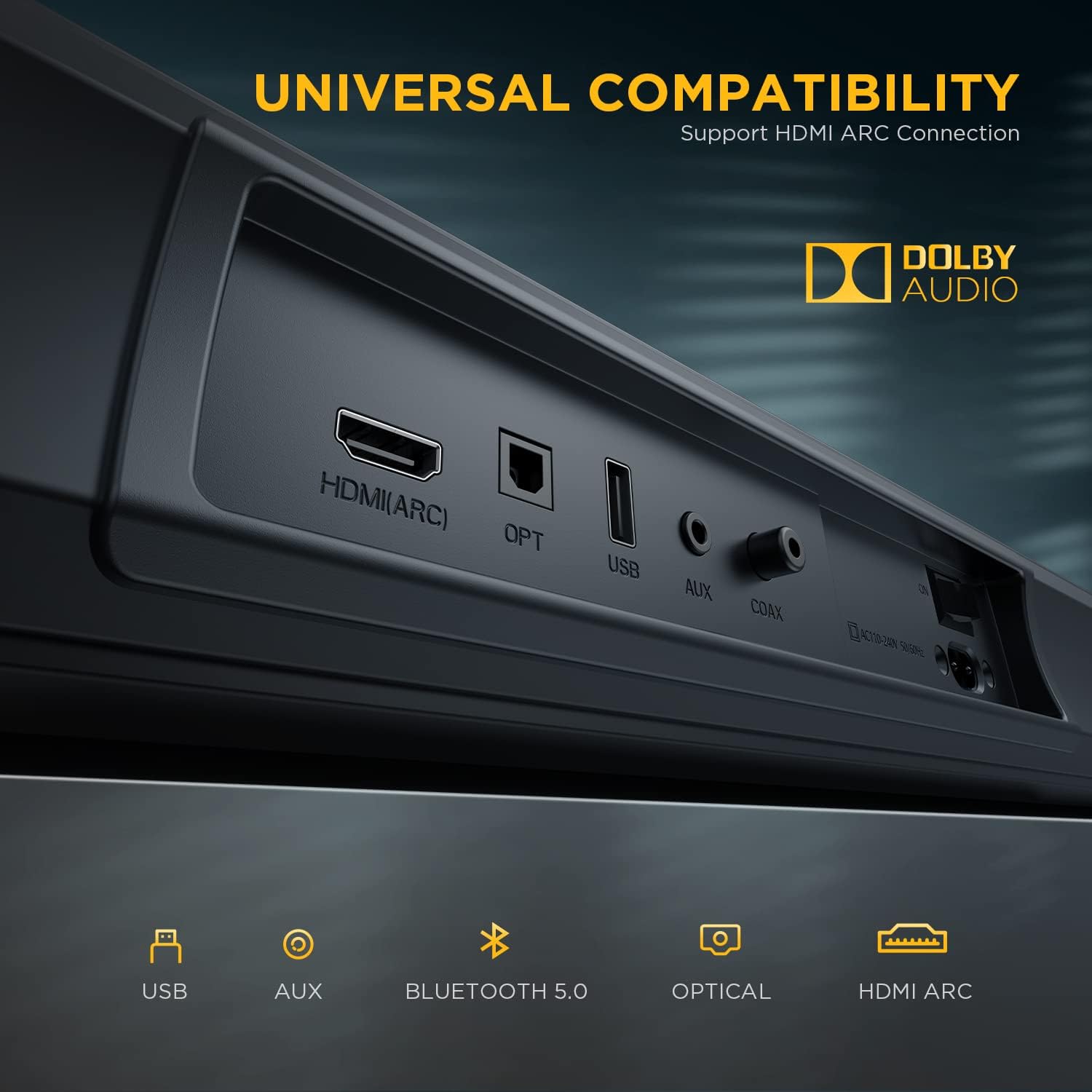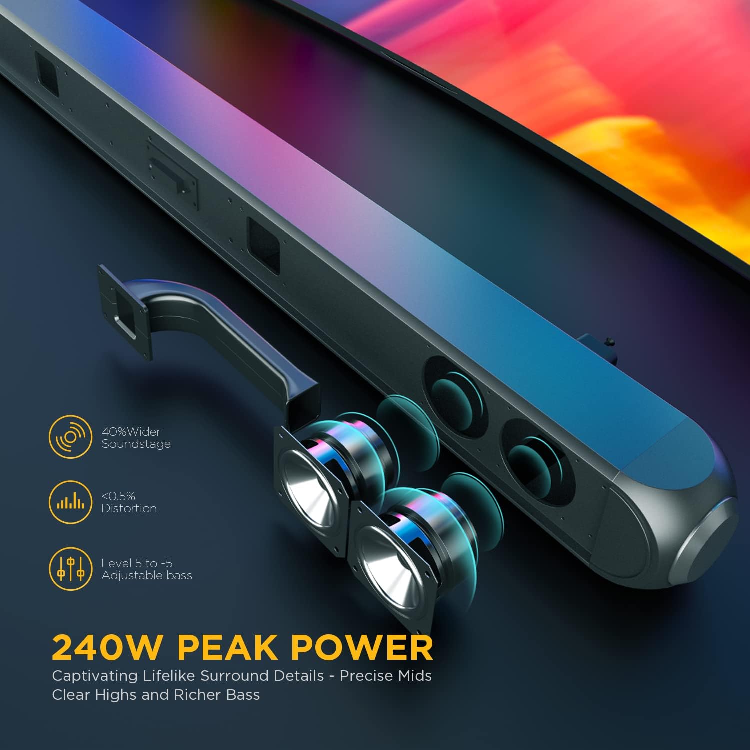 Barra de Sonido Dloby Audio, 240W para TV con Subwoofer Inalámbrico 135 dB 3D Sonido Envolver, 4K HDR, 0.5% THD con Óptico/HDMI ARC/Aux/USB/Bluetooth 5.0 Cine en Casa