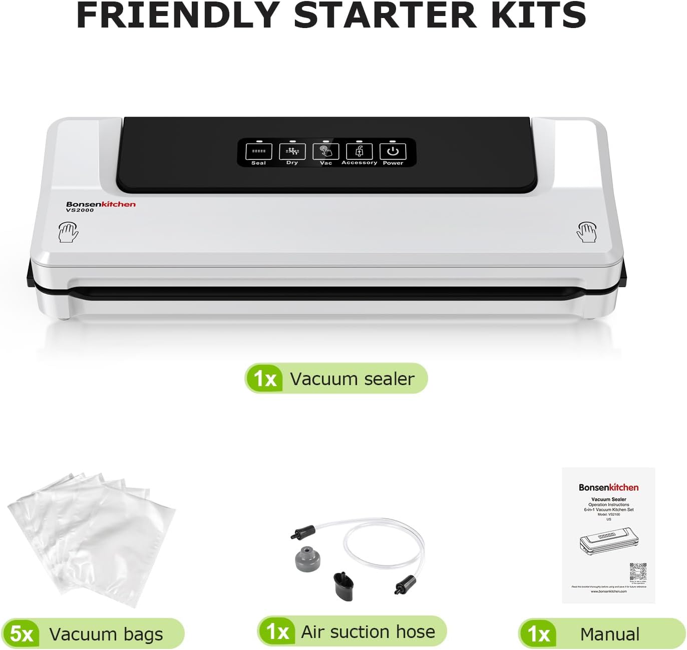 Bonsenkitchen Envasadora al Vacío 4 en 1 para Uso Doméstico y Comercial, Maquina al Vacio de Alimentos, Incluyendo 5 Bolsas (20 x 30 cm), VS2000