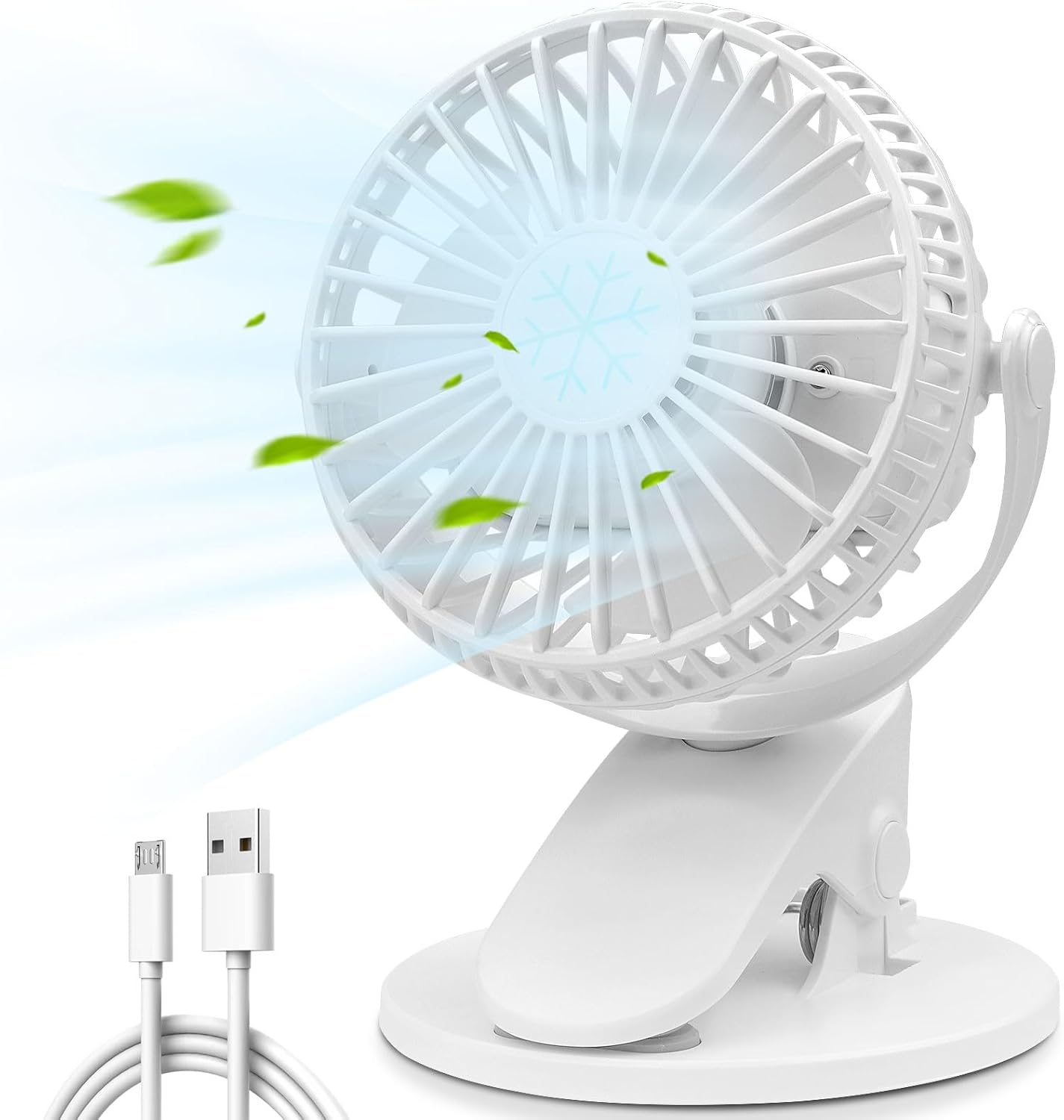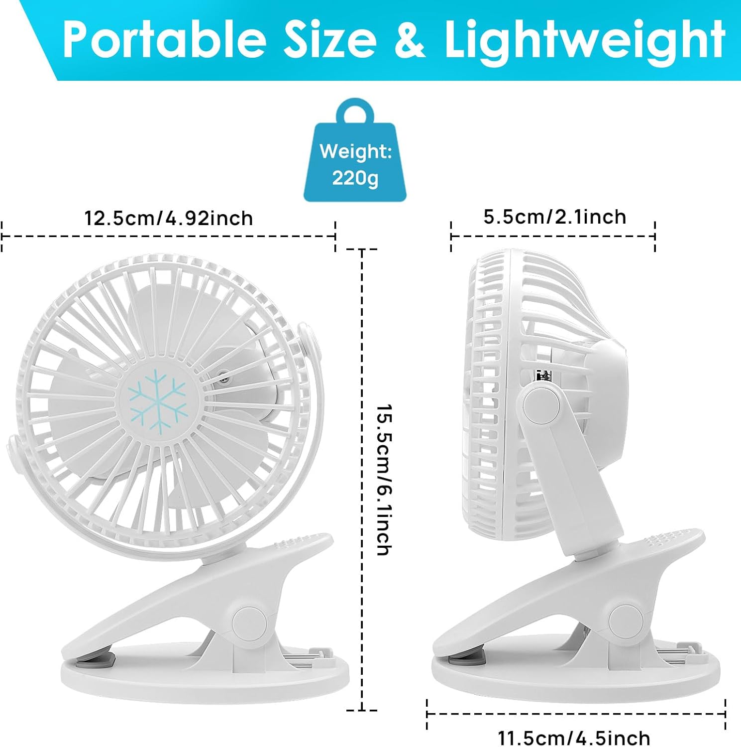 Compacto & Seguro – Clip on Fan está Diseñado para ser Compacto y Fácil de llevar (6.69 * 6.29 * 2.1inch). Es Seguro de Usar Incluso para Bebés y Niños Pequeños, protegiendo los dedos curiosos de las aspas del Ventilador en movimiento. El Diseño Fácil de Usar Permite a las madres Utilizarlo con Confianza.