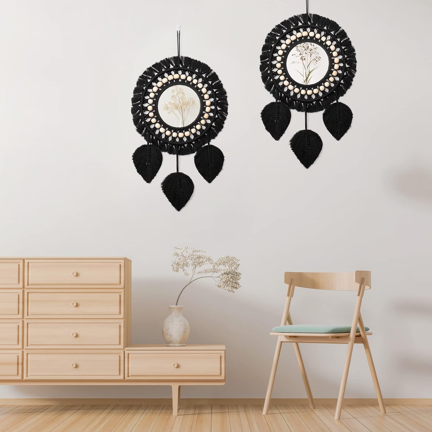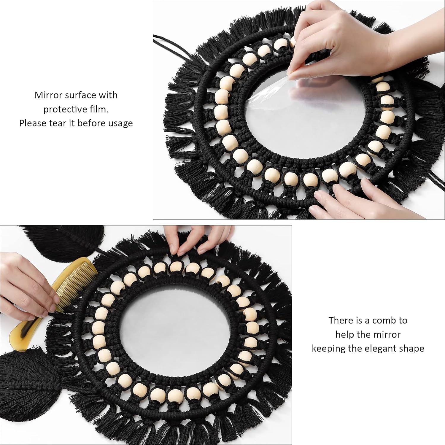 🏡 【Material de alta calidad】 Está hecho de algodón, cuentas de madera y espejo, es duradero, resistente al desgaste y respetuoso con el medio ambiente, muy delicado y práctico. El espejo está tejido con forma de rayos de sol. Exquisito diseño de proceso de tejido, elegante y chic.
