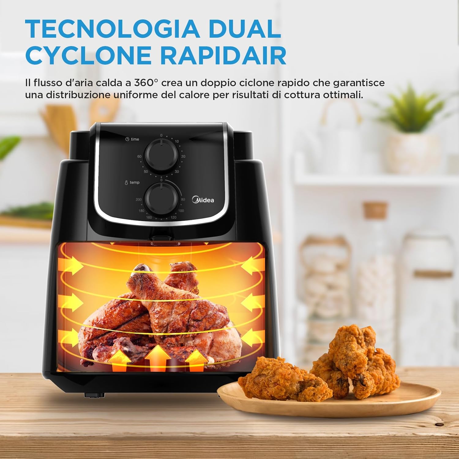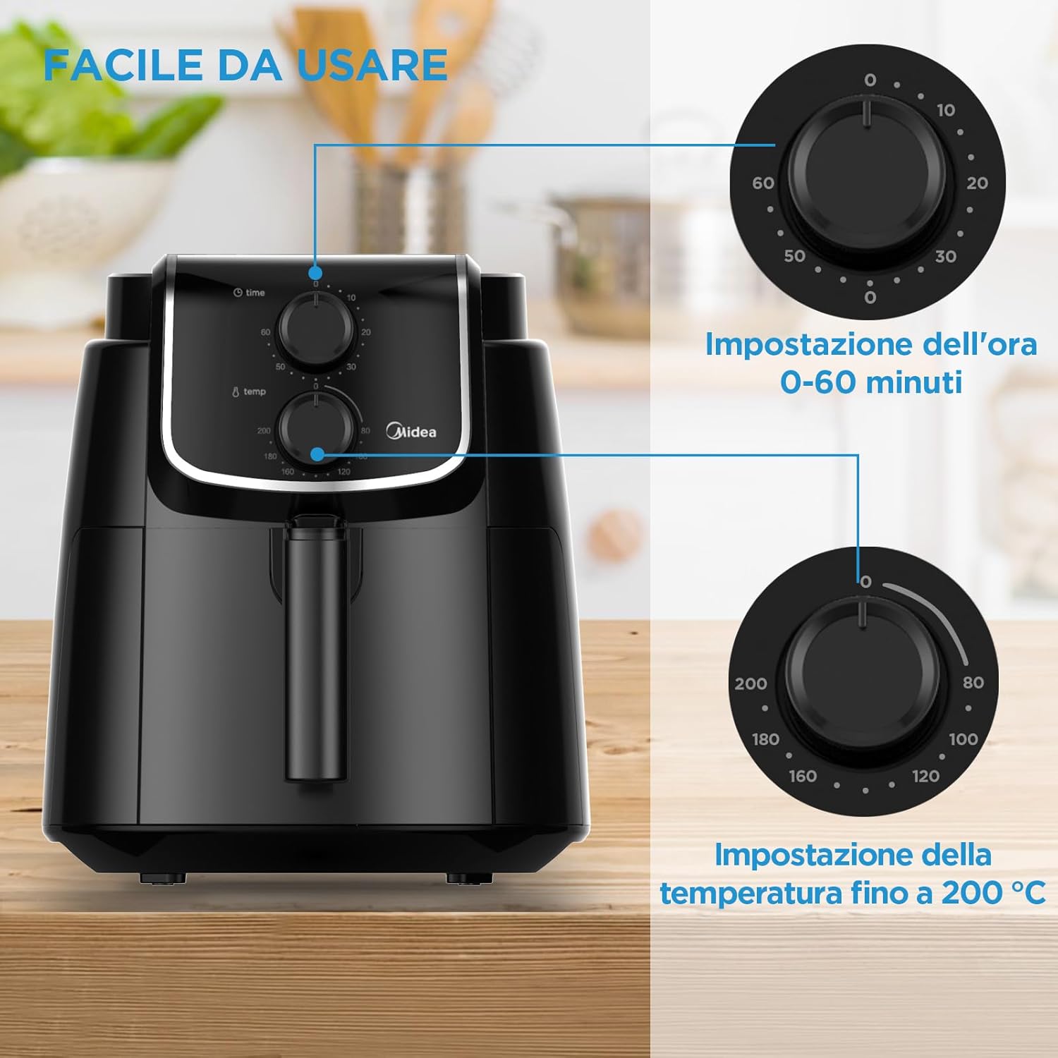 Midea MF-TN35D2 Freidora de aire 3,5 litros, Freidora sin aceite, temperatura máxima 200 ℃, 60 minutos temporizador, funciones múltiples, negro
