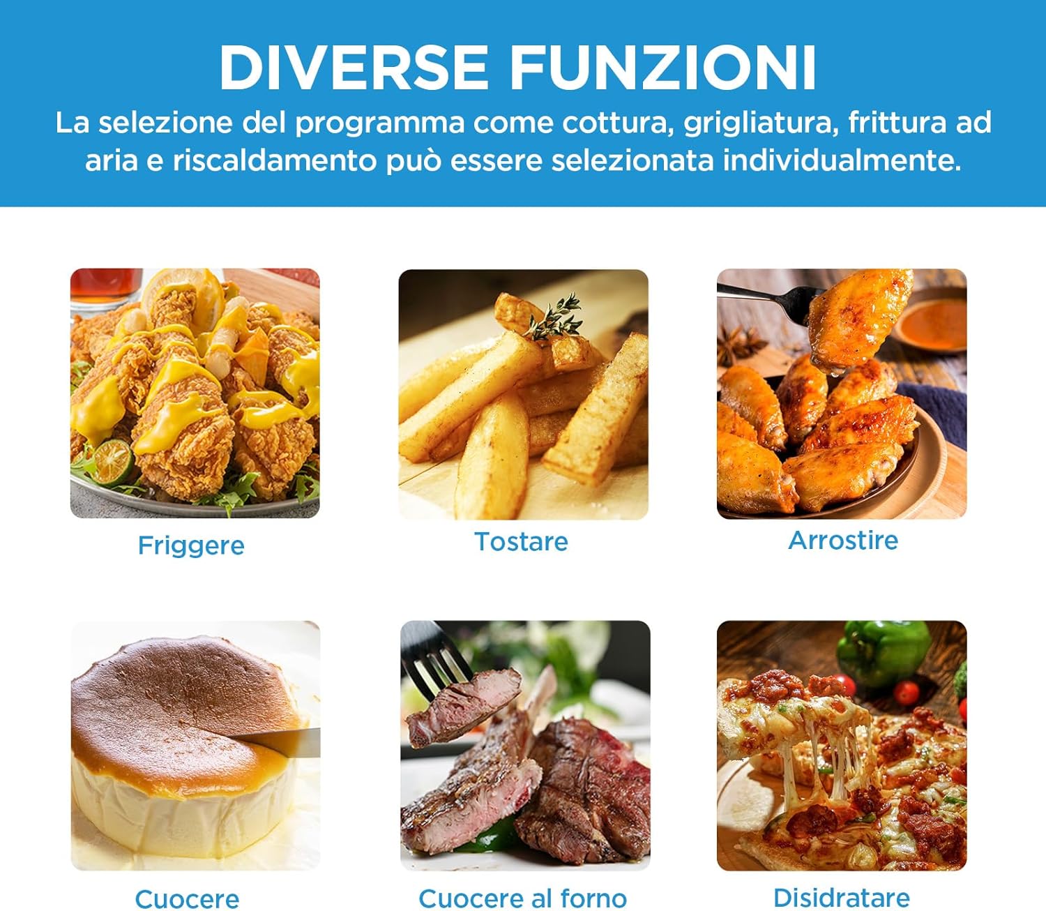 Selecciona las funciones de cocción, parrilla, fritura de aire, rosetón y calentamiento para satisfacer todas tus necesidades.