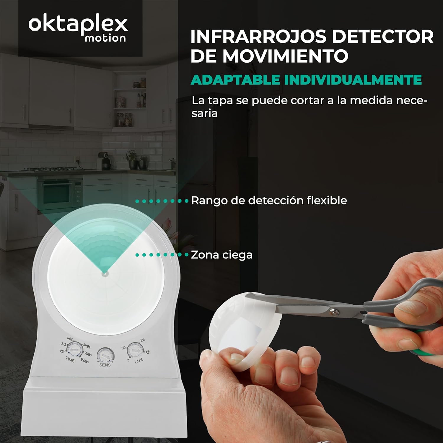Sensor de movimiento de 240° con tapa para reducir el ángulo de detección. Sensibilidad regulable para ajustar la sensibilidad.